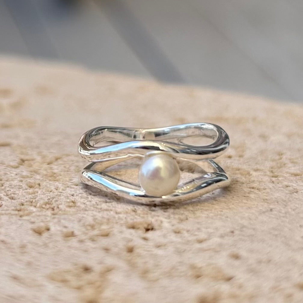 This elegant design features two flowing sterling silver lines that softly curve around the finger, cradling a luminous freshwater pearl at the centre. The organic, wave-like form creates a sense of motion and calm, allowing the pearl to appear as though it’s floating effortlessly within the silver.